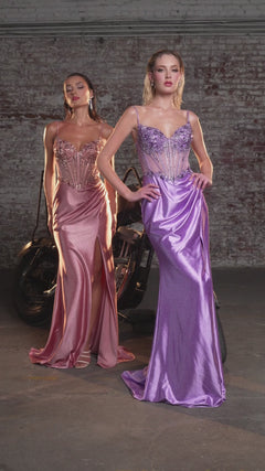 Two women stand side by side in evening gowns with high slits and beaded bodices; one wears the Ladivine CC408 Beaded-Corset Long Black Prom Gown, while the other glows in light blue.