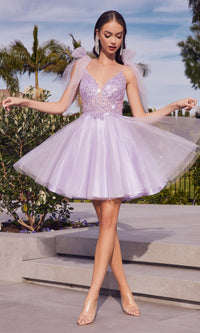 Sweet and sparkly, this short homecoming dress has sheer tulle shoulder bows that offer an adorable look for your semi-formal event. With a shimmering sequin bodice, this short party dress has a sheer inset at the plunging v-neckline and bowed shoulder straps that lead to the deep v-back. The short a-line dance dress has a fully-lined short skirt with a sheer tulle overlay that makes it a figure-flattering choice for homecoming, sweet-16 parties, and other fancy dances. Affordably priced under $150, this sequin-bodice short homecoming dress is as romantic as it is dazzling.