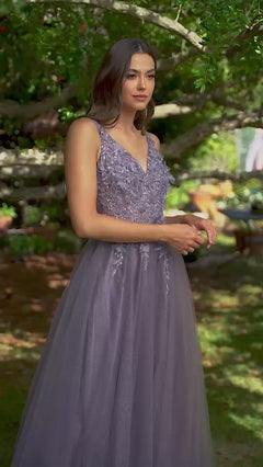 A picture of sophistication, this glitter tulle illusion prom dress is a shimmering dream come true. Enhancing the natural sparkle of the glitter tulle, beaded embroidery swirls across the sheer bodice of this v-neck prom dress. Fluttering 3-D floral details pop against the embroidery. In a v-shape, the open back of this embroidered prom dress adds a daring touch. Make an elegant impression when you wear this glitter tulle long prom dress to your next formal special occasion.
