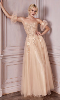 Here's a plus-size prom ball gown that is two beautiful styles in one. With adorable short puff sleeves, this plus-size prom dress is a sweet style, but when you opt to remove the sheer sleeves, it becomes a sleeker strapless design. With glistening floral embellishments from the sweetheart neckline to the hips, this plus-size evening gown has a corset-style bodice that wraps around to the lace-up back, while the fully-lined long skirt has a sheer overlay that flows to the floor in an a-line shape. Be selfie-ready when you choose this plus-size prom ball gown with removable sheer puff sleeves.