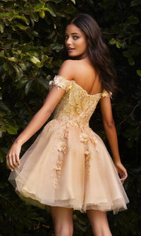 Bold 3-D floral embellishments make this off-the-shoulder short homecoming dress truly unique. Beautiful for homecoming, wedding receptions, and other semi-formal events, this short a-line party dress has a corset-style bodice with banded sleeves for a look of romance. The sweetheart hoco dress has a fully-lined short skirt with a floral-embellished sheer overlay that flows to the hem in a flattering a-line shape that finishes the look. A bargain at under $200, this wallet-friendly off-the-shoulder short homecoming dress is offered in misses and plus sizes.
