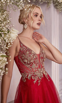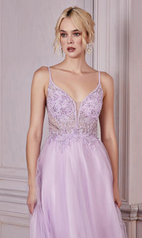 This beautiful long tulle a-line prom dress is as sparkly as it is figure flattering. With a sheer embellished bodice, this deep v-neck evening gown is sure to shine at prom, military balls, and other formal events. Thin shoulder straps lead to the deep v-neckline, while the swirling beaded embroidery flows over the waist to the skirt. Offered in misses and some plus sizes, this elegant long formal dress has a fully-lined long skirt with a sheer overlay that flows to the floor in a flattering a-line shape. Surprisingly affordable, this long tulle a-line prom dress (under $200) is sure to the highlight of the night without the high price tag.