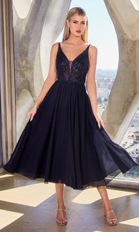 So elegant, this tea-length a-line party dress CD0225 is ready to elevate your evening look. Whether you're attending homecoming, a fancy dinner party, or another semi-formal event, this v-neck short a-line dance dress is a classic style that is so sophisticated. Offered in misses and some plus sizes, this midi-length semi-formal dress has a gleaming sheer v-neck bodice with a matching deep v-back, while the fully-lined skirt has a sheer overlay that flows to the tea-length hem in an a-line shape to finish the design. At under $150, this tea-length a-line party dress from Ladivine is a combination of elegant simplicity and affordability.