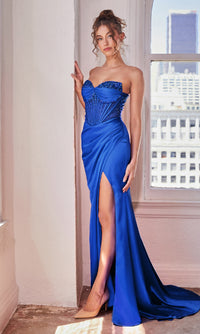Bold and beautiful, this strapless long prom dress is a curve-hugging choice with lots of dazzling details. Daisy-shaped beaded details flow from the sweetheart neckline to the waist of this fabulous strapless formal dress, while the sheer corset-style bodice wraps around to the thin bands that lace up over the open back. In misses and plus sizes, this very special evening gown has tummy-camouflaging ruching at the hips, while the long skirt opens in a side slit before reaching the floor. A phenomenal pick for prom, fancy galas, and other formal events, this strapless long prom dress is sure to give you a striking entrance every time.