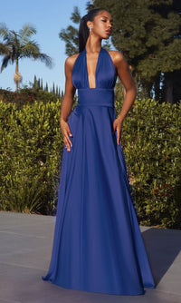 Versatile and chic, this long infinity prom dress by Ladivine offers a variety of necklines that makes it easy to change up your look whenever you please. Long ruched straps extend from the wide waistband of this a-line prom dress and can be crossed, twisted, and arranged in many different ways. Pulling the straps off to the side of your neck creates a one-shoulder prom dress with a sultry front cut out, while tying the straps behind the neck creates a halter prom dress with a plunging low v-neckline. The floor-length faux-wrap skirt on this infinity prom dress has a high side slit that heightens the allure. With this gorgeous long infinity prom dress, you're guaranteed multiple looks in one design.