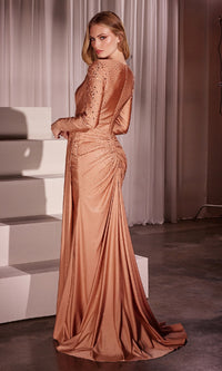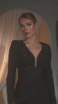 | Details: | Form Fitting, Ruching, Scattered Beading, Long Sleeves, Slit |