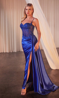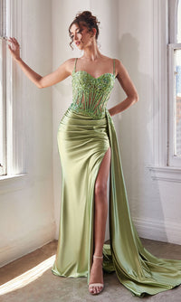 Sparkly beaded lace makes this long sweetheart prom dress an eye-catching choice for your big formal. With a sheer embellished bodice that wraps around to the back of this gorgeous long formal dress, matching beaded-lace applique tops the side drape that flows from the waist to the floor for a dramatic look at prom, galas, and other black-tie events. Tummy-camouflaging ruching tops the long skirt that opens in a side slit before draping to the floor to complete the look of this long sweetheart prom dress that is a contemporary design with lots of shimmering details.