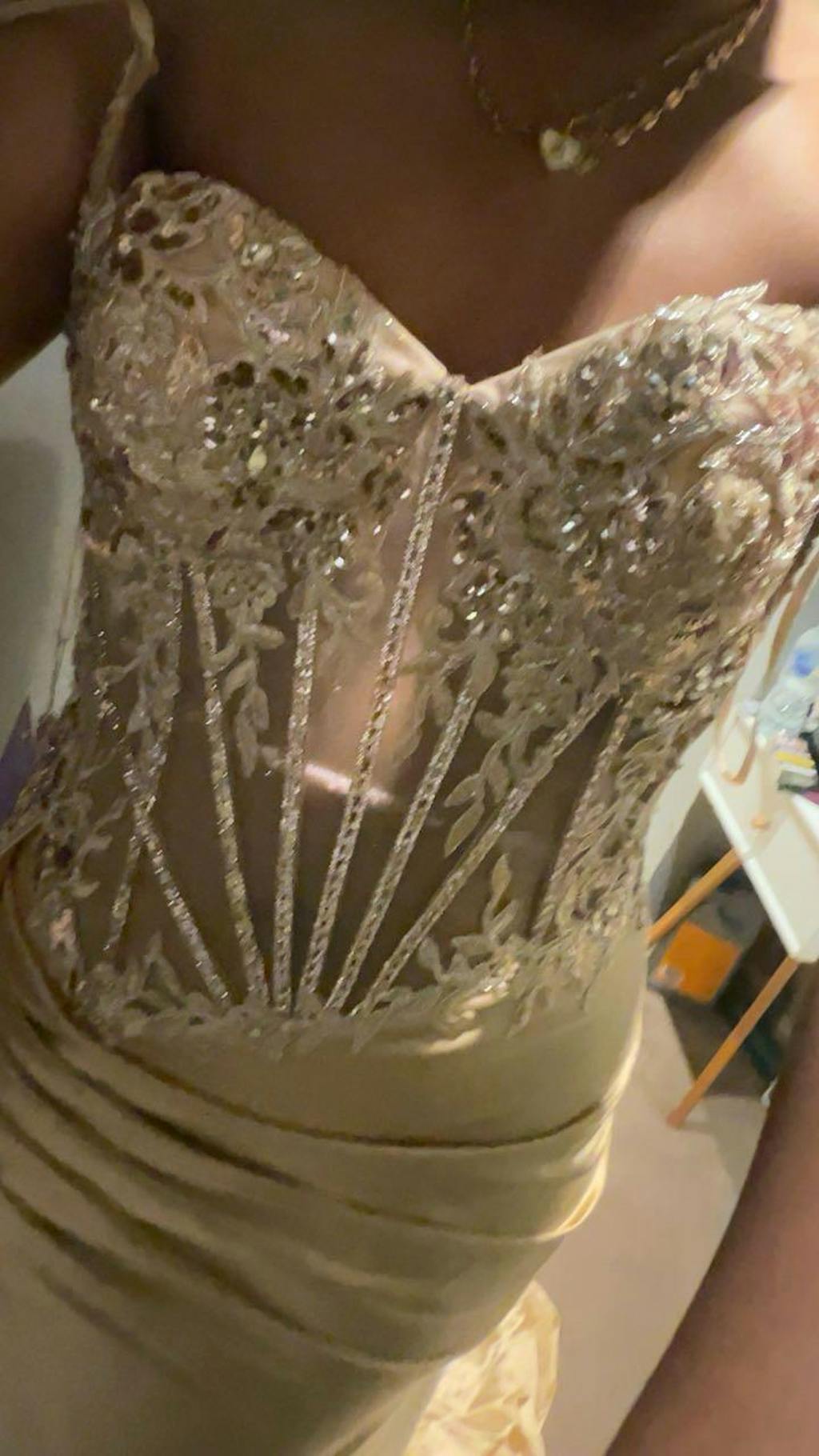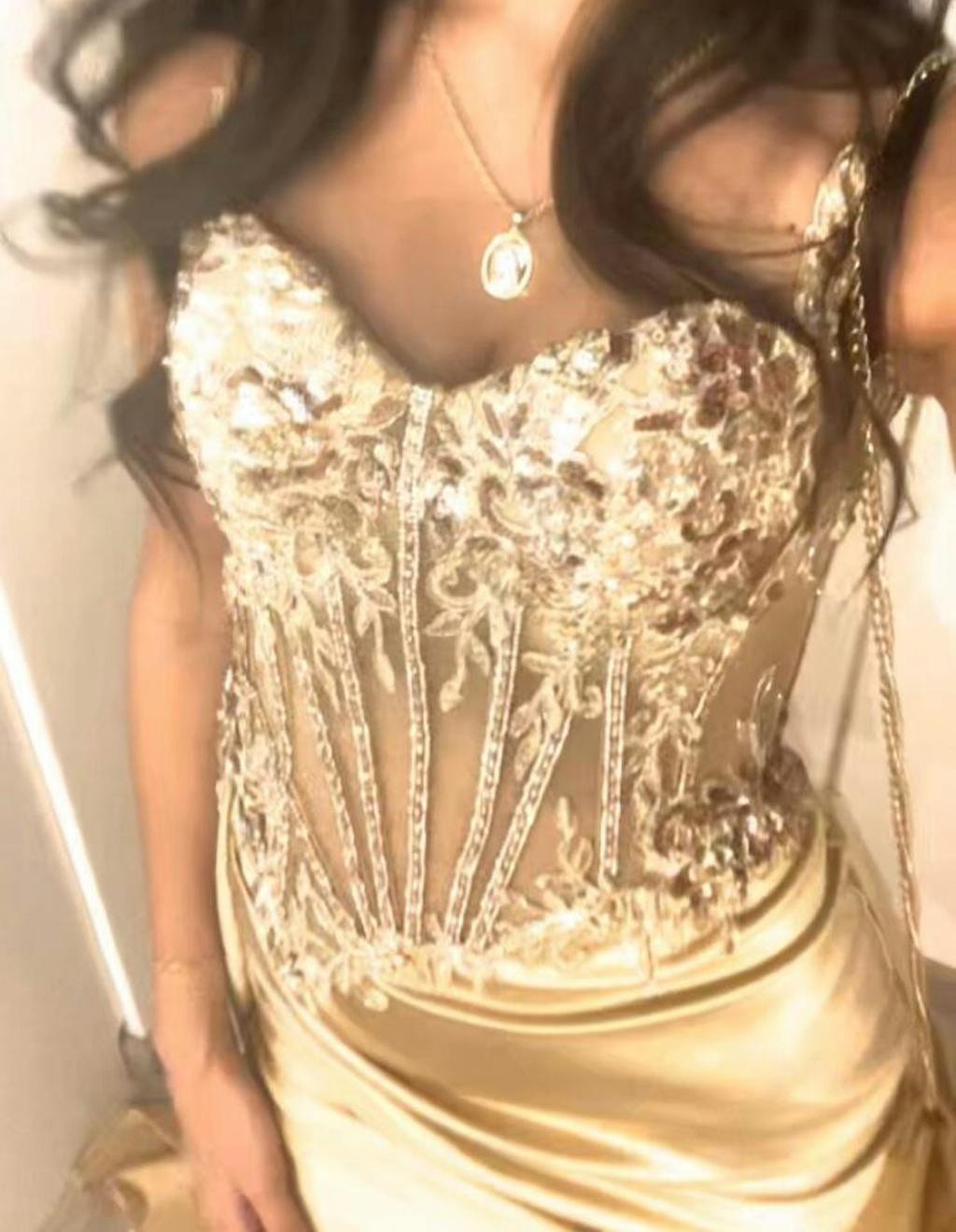 Woman wearing a long gold prom dress with a sheer corset bodice standing in front of a mirror with draped curtains.