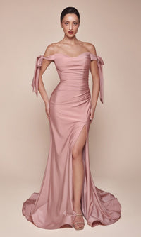 Sweetly sensual, this plus-size long prom dress flatters the figure with feminine details. In gleaming fabric from the sweetheart neckline to the floor, this plus-size evening gown has adorable shoulder bows that adjust for the best fit. Ruching offers a fitted look on this plus-size long formal dress, while the hip-skimming long skirt opens in a side slit to complete the look. Priced under $150, this plus-size long prom dress is an upscale style that won't cost a fortune.
