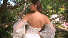 Romance is in the air when you slip into this long white wedding dress that offers options for your big day. With detachable off-the-shoulder sheer blouson sleeves, this strapless long white evening gown gives you the choice of a sleeker style if you so desire. With embellished floral designs on the sheer sweetheart corset bodice, this long white formal dress gets a flirty look for weddings, prom, or other black-tie events, while the multi-layered long skirt flows to the floor in an a-line shape. At under $350, this affordable strapless long white bridal gown is a budget-friendly choice for the walk down the aisle.