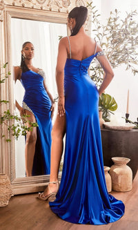 Here's a gorgeous asymmetric long prom dress that will give your look a spectacular elevated edge. With a bead-embellished bust and a fringed one-shoulder banded sleeve, this fabulous long formal dress is an ultimate show stopper for prom, galas, and pageants. Beaded shoulder straps provide support, while this ruched long evening gown has matching beaded trim at the thigh-high side slit for a sexy vibe. A small train completes the look of this embellished long prom dress that showcases a glitzy and glamourous side with every step on the red carpet.