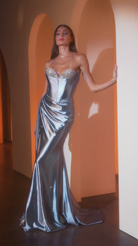 | Details: | Fitted, Corset, Beading, Micro-Crystals, Ruching, Slit, Side Sash |