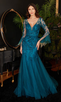 This gorgeous peacock blue long formal dress is a sophisticated choice for any special occasion. Crafted with delicate lace applique from the deep v-neckline to the knees, this long blue dance dress is a timeless style for prom, galas, and military balls. In misses and some plus sizes, this peacock blue long evening gown has sheer bell sleeves with matching lace, while the hip-skimming long mermaid skirt has sheer tulle godets that flow to the floor to complete the stunning and dramatic look. At under $250, you don't have to spend a fortune to make a lasting impression when you choose to make your entrance in this classy peacock blue long formal dress from Ladivine.