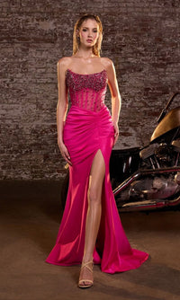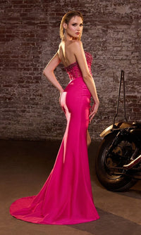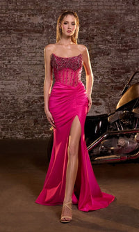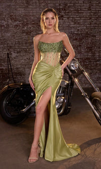 Wow the crowd in this fabulous beaded-corset strapless long prom dress CW301 from Ladivine by Cinderella Divine. With an eye-catching beaded sheer corset-style bodice, this strapless evening gown shimmers in the spotlight at prom, galas, and other formal events. The elegant strapless long formal dress has a mermaid skirt with tummy-camouflaging pleats, a wide side slit, and a small train. Priced under $200, this beaded-corset strapless long prom dress is sure to captivate the night without emptying your bank account.