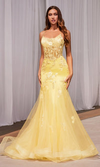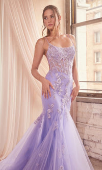 In soft pastel, this long floral mermaid prom dress is as charming as it is figure flattering. This strappy open-back evening gown provides the perfect mermaid silhouette, while beautifully embellished floral details and shimmering crystals provide just enough sparkle to draw attention. A beautiful fit is assured by thin shoulder straps that sensually lace up over the open back of this long mermaid dress while the embellished sheer corset-style bodice wraps around the waist. The layered sheer tulle mermaid skirt finishes the look of this long pastel prom dress that is a glamorous choice for prom, pageants, and other formal events.