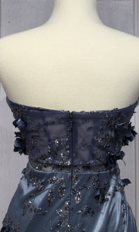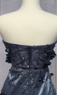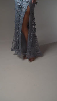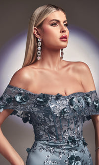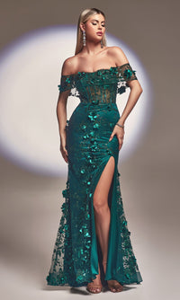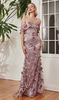 Slip into this beautiful off-the-shoulder long glitter prom dress and catch the spotlight. With 3-D flowers and sparkly glitter prints from the off-the-shoulder neckline to the floor, this elegant long evening gown offers a one-of-a-kind look for prom, galas, and other red-carpet events. Creating a romantic cape, the glittery sheer off-the-shoulder band hugs the upper arms before attaching at the back of this fabulous long prom dress, while the sheer corset-style waist wraps around to the back. In misses and some plus sizes, this gorgeous long formal dress has a mermaid-style skirt that hugs the hips before opening in a side slit and ending at a dramatic floor length. At under $150, this eye-catching off-the-shoulder long glitter prom dress is sure to turn heads without busting your budget.