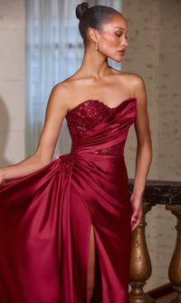 Create beautiful memories in this strapless long prom dress from Ladivine by Cinderella Divine. With a diagonal pleated sash at the front of the sheer lace corset, this strapless evening gown gets an upscale look for prom, galas, and other formal events. The long skirt has a draped sash that flows to the floor, while a wide side slit adds a sexy vibe to this strapless long formal dress. At under $200, this fabulous strapless long prom dress offers a couture look without the couture price.