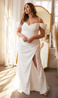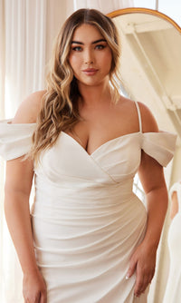 Here's a plus-size long white formal dress that is as beautiful as it is figure flattering. With a cold-shoulder bodice, this plus-size long white evening gown is crafted in soft crepe from the surplice v-neckline to the hem. The plus-size long white dance dress has tummy-camouflaging ruching at the waist and a hip-hugging long skirt that opens in a side slit before pooling into a small train. So classy for weddings, prom, or military balls, this plus-size long white formal dress is simply stunning.