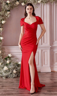Here's a beautiful long satin prom dress KV1061 by Ladivine that indulges in sultry allure. In misses and some plus sizes, this elegant long evening gown features a shawl that exposes the upper back before draping over the shoulders for a cap-sleeve look. The short sleeve long satin formal dress has a fitted sweetheart bodice and a hip-skimming long skirt that opens in a side slit before pooling into a romantic sweep train. Affordably priced under $100, this long satin prom dress will wow the crowd at prom, galas, and other formal events without emptying your bank account.