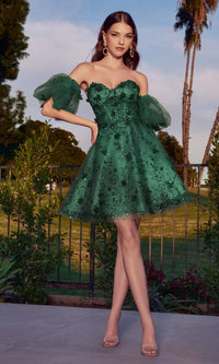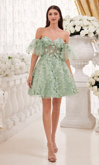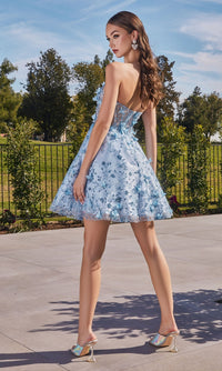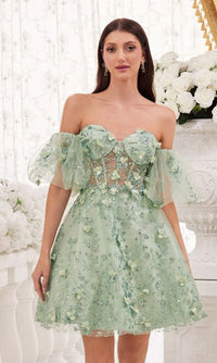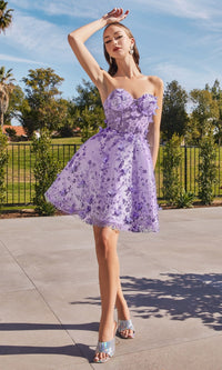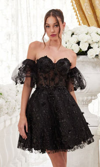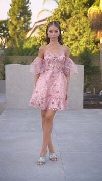 Simply stunning, this short strapless homecoming dress is two beautiful dresses in one. With floral embellishments from the sweetheart neckline to the hem, this gorgeous a-line party dress has fabulous puff sleeves that are easily removable for a totally strapless look. With a sheer corset-style waist, this strapless cocktail dress has a fully-lined short skirt with a sheer floral-embellished overlay that flows to the hem in an a-line shape. Affordably priced under $150 for homecoming, wedding receptions, and other semi-formal events, this short strapless homecoming dress is a gorgeous feast for the eyes.