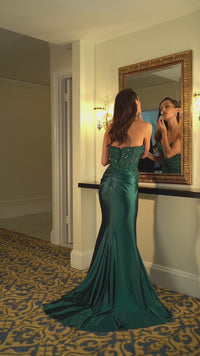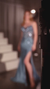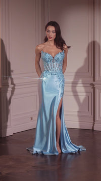 From Ladivine, this fabulous strapless long prom dress KV1112 is simply spectacular. With shimmering sequins from the v-neckline to the hips, this strapless long formal dress sparkles in the spotlight for prom, galas, and other black-tie events. The strapless evening gown has a sheer corset that wraps around to the back, while the hip-skimming long skirt has a thigh-high side slit and a small train that brings the drama. At under $200, this strapless long prom dress is designed to make a dazzling fashion statement without wrecking the budget.