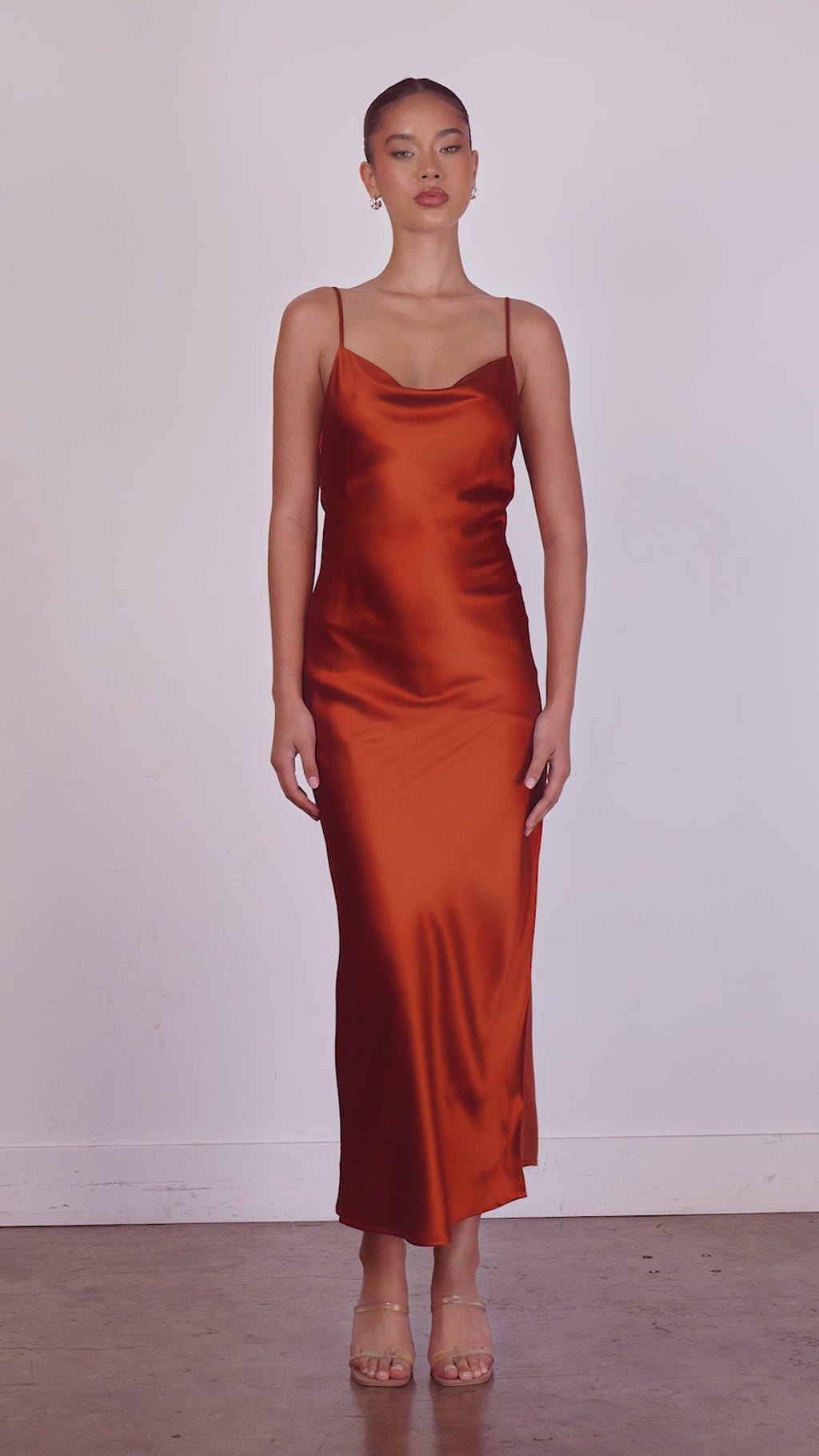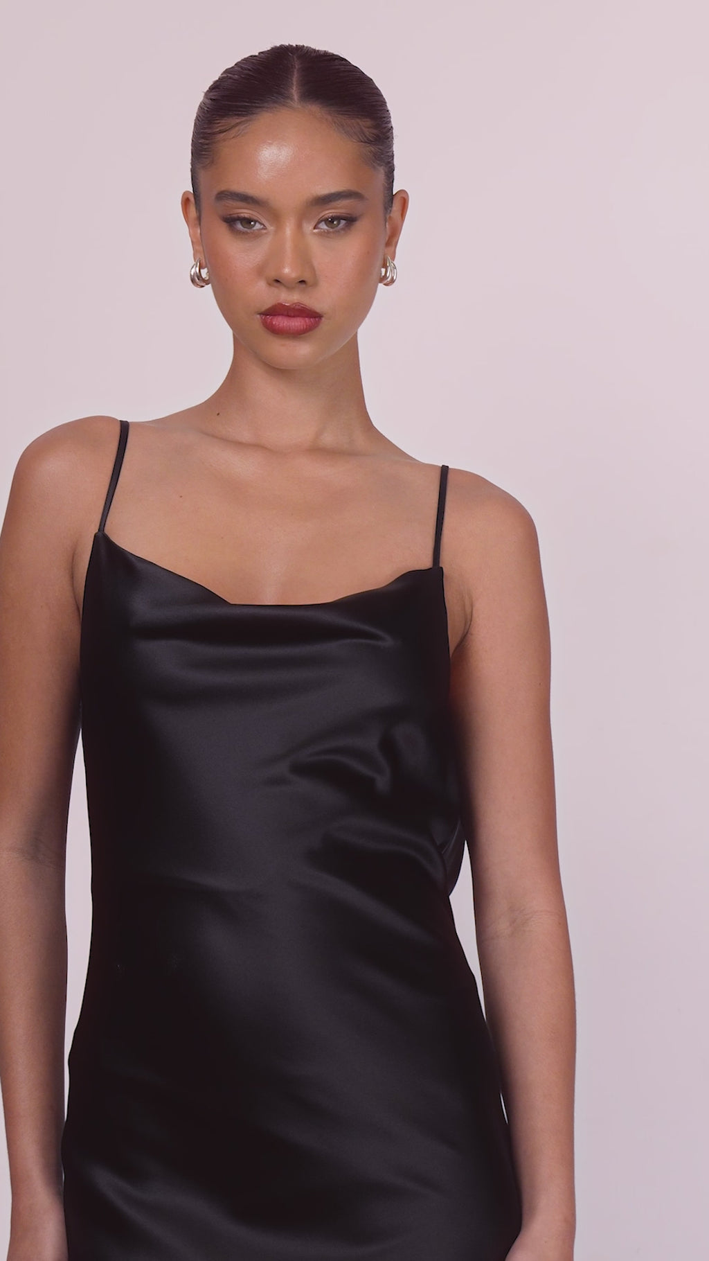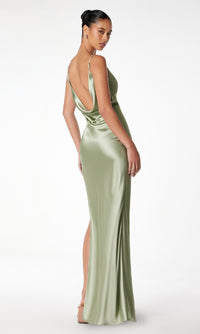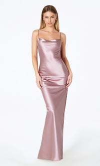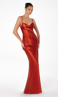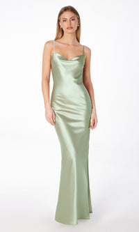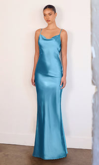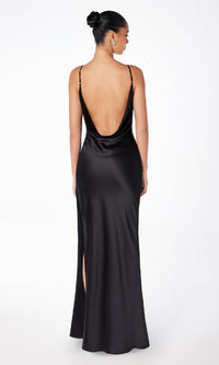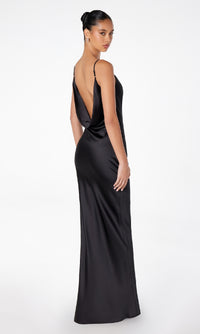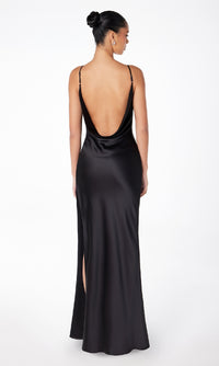 Honor the curves in this sexy long prom dress by Astee. In gleaming fabric from the draped neckline to the hem, this floor-length evening gown has thin shoulder straps that lead to the unique cowled open back detail. The slinky long formal dress smooths over the curves before opening in a side slit and draping to the floor. Step into a world of elegance at prom, galas, and other formal events when you choose this sexy long prom dress that is budget priced under $100.