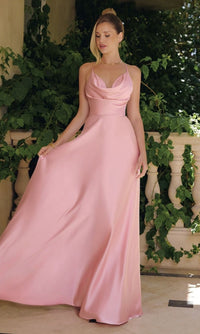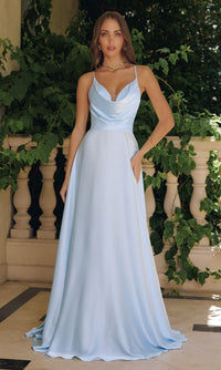 Check out this romantic cowl-neck long prom dress T714 from Amoris by Cinderella Divine. With a dramatic cowl-neck bodice, this beautiful long a-line formal dress gets a sexy vibe with thin shoulder straps that criss cross the open back. In misses and some plus sizes, this elegant long evening gown has a long a-line skirt that flows to the floor for a figure-flattering look at prom, galas, and other formal events. Budget-priced well below $150, this cowl-neck long prom dress is a stunning blend of modern elegance and affordability.
