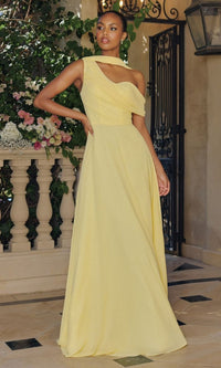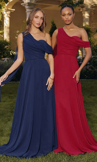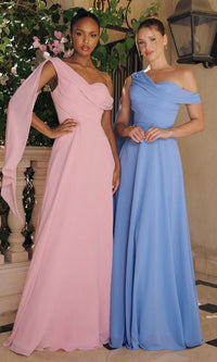 This dreamy long a-line prom dress T716 from Amoris by Cinderella Divine is ready for your big entrance. With an off-the-shoulder asymmetric neckline, this long formal dress has a shoulder drape that flows away to the hips for a romantic look at prom, galas, and other black-tie events. In misses and some plus sizes, this gorgeous evening gown has a multi-layered long skirt that flows to the floor in an a-line shape that flatters the figure. Affordably priced under $150, this long a-line prom dress is modern elegance without the high price tag.