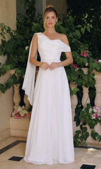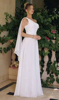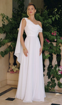 If you're a bride on a budget, this gorgeous long off-white wedding dress T716W from Amoris by Cinderella Divine is a wonderful choice. At under $200, you can have this gorgeous long off-white bridal gown with an asymmetrical neckline and a romantic shoulder drape. The long off-white formal dress has a fully-lined long chiffon skirt that offers a figure-flattering look for weddings, prom, and other black-tie events. A celebration of romantic style, this long off-white wedding gown allows you to step into your fairytale romance with timeless elegance and allure.