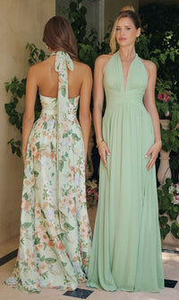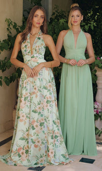 Elevate your evening look in this open-back long floral print sage halter prom dress T719 from Amoris by Cinderella Divine. Offered in misses and some plus sizes, this long floral print formal dress has a deep v-neck halter with shoulder straps that tie at the back of the neck before hanging down over the open back. The floral halter evening gown has a long chiffon skirt that flows to the floor in an a-line shape for a flattering look at prom, galas, and other formal events. Surprisingly affordable at under $150, this open-back long green floral halter prom dress is more than just a dress, it's a beautiful story waiting to be told.