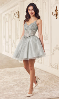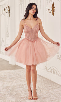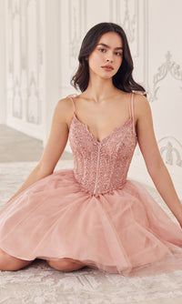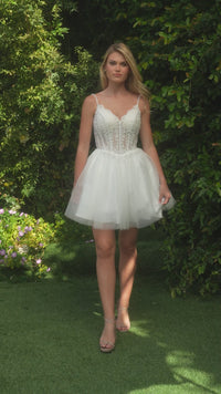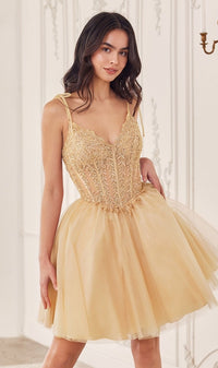 Wearing the Ladivine embroidered lace homecoming dress CD0236, be the epitome of elegance and charm for your next homecoming event. This enchanting a-line homecoming dress features a babydoll silhouette that's both flattering and cute. The sheer corset bodice is adorned with intricate embroidered lace that adds a touch of sophisticated femininity to your look. Designed for both beauty and comfort, this short homecoming dress includes adjustable shoulder strap ties that help you achieve the perfect fit. The flowy a-line skirt on this sheer-bodice homecoming dress is playful and ideal for dancing the night away. Whether you're attending homecoming or another semi-formal occasion, this corset homecoming dress by Ladivine is a standout choice.