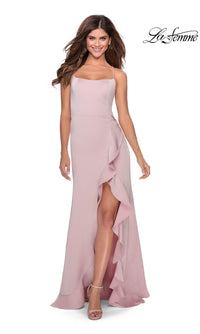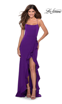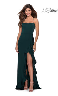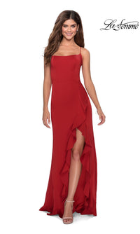 From La Femme, this long prom dress is a sleek style with feminine flair. So pretty for prom, galas, and other formal events, this open-back long designer dress has a floor-length skirt with a side slit that is trimmed with wide frilly ruffles. In misses and some plus sizes, this long formal dress has thin shoulder straps that criss cross the open back before lacing up for a comfortable fit. If you love ruffles and sophisticated style, this long prom dress by La Femme is for you.