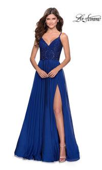 If you're looking for a long a-line prom dress 28664 that is as flowy as is beautiful, this one is it! From La Femme, this elegant long designer dress has a fully-lined long skirt with a eye-catching sheer overlay that opens in a side slit before draping to the floor in a free and flowy a-line shape. The v-neck long a-line formal dress has a sheer embroidered-lace bodice that tops the flowy skirt for beautiful combination that is sure to be a winner at prom, a fancy wedding reception, and other formal events. Get ready to be the center of attention when you arrive in this glamorous long a-line prom dress that is as figure-flattering as it is flowy.