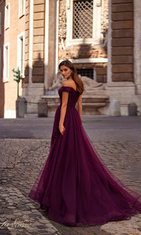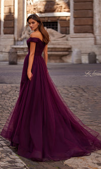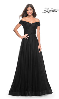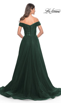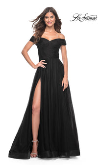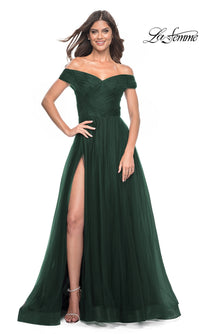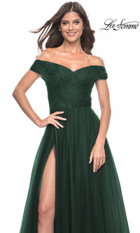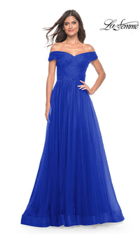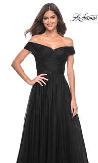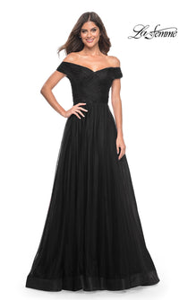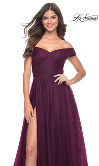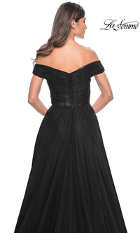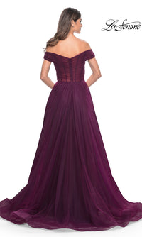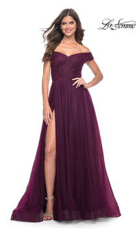 Feel like a princess in this off-the-shoulder long prom ball gown 30498 from La Femme. A symphony of grace and sensuality, this long a-line formal dress features an eye-catching off-the-shoulder bodice with banded sleeves that drape romantically over the upper arms. In misses and some plus sizes, this long designer dress has a fully-lined long a-line skirt with a sheer overlay that opens in a side slit that adds a touch of intrigue that guides the eye. Embrace contemporary elegance with a vintage flair when you slip into this off-the-shoulder long prom ball gown by La Femme.