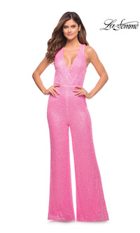 If you're looking for a prom alternative, this long neon pink sequin prom jumpsuit 30811 is sure to wow your friends. From La Femme, this gorgeous pink long designer pantsuit is fully sequined from the surplice v-neckline to the hem for a chic look at prom, galas, and other black-tie events. Wide shoulder straps criss cross the open back of this fabulous long pink formal jumpsuit, while the hip-skimming long pants flare away from the legs to just above the floor. Make a fashion statement that is sure to be celebrated when you slip into this long neon pink sequin prom jumpsuit that is a hot pick for the season.