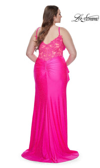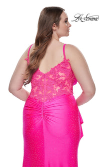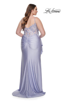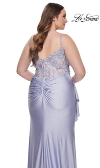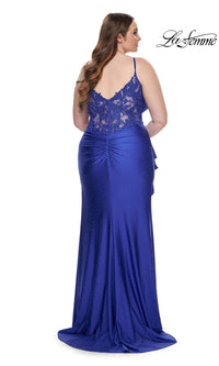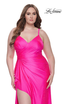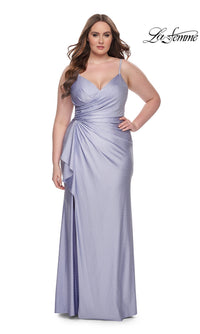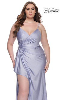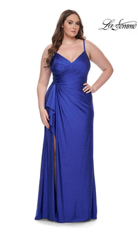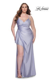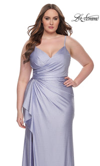Sparkly heat stones give this plus-size long prom dress 31309 a dazzling look for your memorable evening. A faux-wrap design, this plus-size long designer dress by La Femme shimmers from the surplice neckline to the floor for a sparkly look at prom, galas, and other black-tie events. The elegant long plus-size formal dress has thin shoulder straps that lead to the sheer-lace back, while ruching at the waist creates a tummy-camouflaging effect that you will love. With a drape at the side, the faux-wrap long skirt opens in a wide side slit before finishing the look of this plus-size long prom dress that is ready to draw admiring eyes from the moment you enter the room.