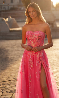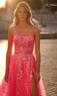 In bright neon pink, this strapless long prom ball gown 32137 is nothing short of fabulous. With sequin floral designs from the straight neckline to the hem, this bright pink long formal dress is sure to shine in the spotlight as you make your way to prom, galas, and other black-tie events. The long pink designer dress has a sheer corset-style waist that wraps around to the back, while the fully-lined long skirt has a sequin-print sheer overlay that opens in a side slit before flowing to the floor in an a-line shape. Get ready to watch heads turn when you make your entrance in this bright neon pink strapless long prom ball gown from La Femme.