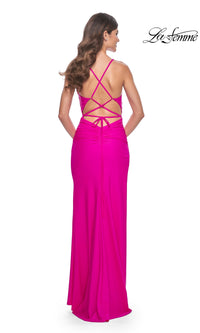 Show off those curves in this long jersey prom dress 32152 from La Femme. Crafted in body-hugging soft jersey fabric from the cowl v-neckline to the hem, this long designer dress gets a fitted look for prom, galas, and fancy wedding receptions. Thin shoulder straps create a statement as they criss cross the open back of this sexy long formal dress, while the hip-hugging long jersey skirt opens in a wide side slit before draping to the floor. A grand entrance is yours when you choose to slip into this long jersey prom dress that hints at seductiveness while giving your look an elevated edge.