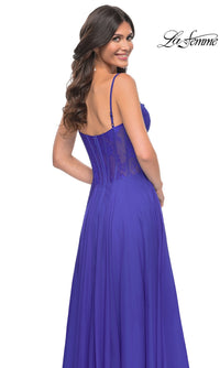Here's a delightful long chiffon prom dress 32276 that allows you to step into the world of elegance. With a trendy floral-lace sweetheart bodice, this long chiffon formal dress gets a sexy upgrade for prom, galas, and other black-tie events. Offered in misses and some plus sizes, this long designer dress features a silky chiffon long skirt that opens in a side slit before softly ending at a dramatic floor length. Simply gorgeous for your big night, this long chiffon prom dress is sure to bring your romantic visions to life.