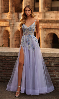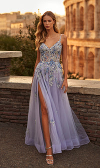 From La Femme, this long lavender purple prom dress 32288 is sure to be a hit. With colorful embroidered lace on the sheer corset-style bodice that wraps around to the back, this long purple formal dress indulges in sultry allure for prom, galas, and other black-tie events. Matching embroidery flows onto the full and fabulous long tulle a-line skirt that opens in a side slit before draping to the floor and pooling into a small train. Bringing your romantic visions to life, this lavender purple long a-line prom dress allows you to stand out with confidence.