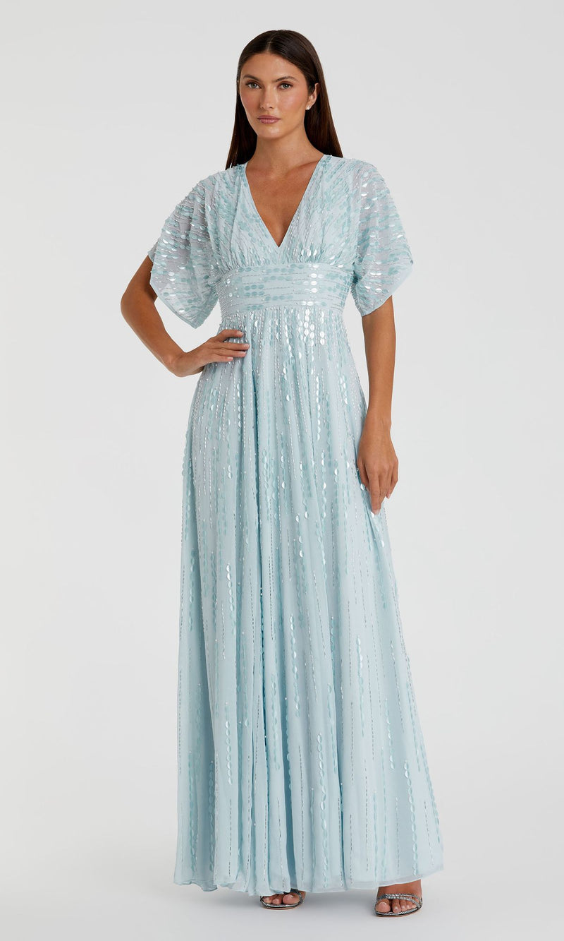 In soft powder blue, this short sleeve long sequin formal dress 10807 by Mac Duggal is as modest as it is sparkly. Rows and rows of shimmering sequins from the v-neck bodice to the hem make this powder blue evening gown a dazzling choice for upscale weddings, baby showers, and other semi-formal to formal events. The long blue special-occasion dress has short flutter sleeves and a wide empire waist that sits atop the floor-length a-line skirt that completes the design. As graceful as it is sparkly, this powder blue short sleeve long sequin formal dress is the perfect balance of elegance and modest style.