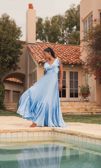 V-neck pastel satin formal dress with pleated crossover bodice, a-line silhouette, short split flutter sleeves, tiered hemline, and v-back.