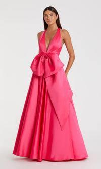 A head-to-toe stunner, this open-back hot pink long halter prom dress 11890 is an upscale choice for your big formal. With a deep v-neck halter bodice, this long hot pink evening gown has thin shoulder straps that attach at the back of the neck, while the open back flashes with every turn. The long pink satin formal dress has a massive oversized front bow that tops the long skirt that flows to the floor in a figure-flattering a-line shape. A hot choice for prom, galas, and other formal events, this hot pink long halter prom dress breaks free of everyday options so that you can create beautiful memories wherever you wish to make your entrance.
