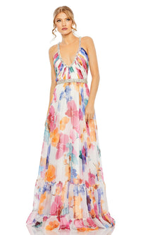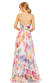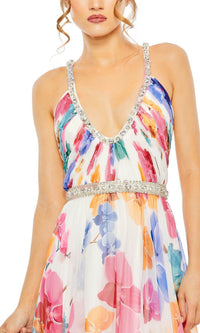 Low scoop neck print a-line flowing formal dress with beaded belt.