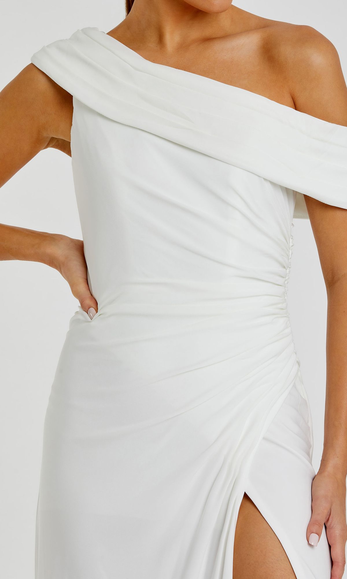 Poise and grace are are yours in this one-shoulder long prom dress 26517 from Mac Duggal. With a diagonal fold-over neckline, this long formal dress gets a uniquely stylish look for prom, galas, and other black-tie events. In misses and some plus sizes, this long evening gown has side ruching for a fitted look, while the long skirt opens in a thigh-high side slit before flowing into a small train that completes the design. Celebrate your big night in sleek style when you choose this one-shoulder long prom dress from Mac Duggal.