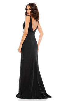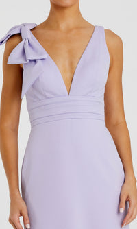 Create beautiful memories in this deep v-neck long prom dress 49454 from Mac Duggal. With a plunging v-neckline, this long a-line formal dress gets a super-feminine look with an oversized bow on one shoulder. In misses and some plus sizes, this long evening gown has thin shoulder straps that lead to the matching v-back, while an empire waist offers a long and lean look for prom, galas, and other black-tie events. The long a-line skirt finishes the look of this v-neck long prom dress that is the perfect balance of classic style and feminine details.