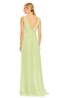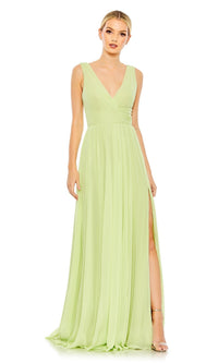 Bold, bright, and beautiful, this lime green long a-line prom dress is a hot pick for the girl who loves an eye-catching style. In misses and some plus sizes, this long green formal dress has a surplice v-neckline and a wrap-around banded waist that flatters the figure for prom, fancy wedding receptions, and other black-tie events. From Mac Duggal, this long green designer dress has wide shoulder straps that lead to the deep v-back, while the long skirt opens in a side slit before flowing to the floor in an a-line shape that flatters the figure. As charming as it is bright, this lime green long a-line prom dress is sure to get double takes at your black-tie formal.