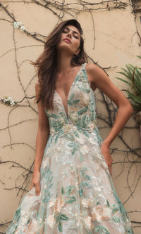 So beautiful, this long cream prom dress 79329 by Mac Duggal is a tantalizing symphony of grace and sensuality. With multicolored embroidered flowers from the plunging v-neckline to the hem, this long white formal dress is a romantic choice for prom, galas, and other black-tie events. The long white evening gown has thin shoulder straps that lead to the v-back, while the fully-lined long skirt has a sheer embroidered overlay that flows to the floor in an a-line shape. Step into a fairytale romance when you choose to make your entrance in this long cream prom dress that is a vision of timeless elegance and allure.