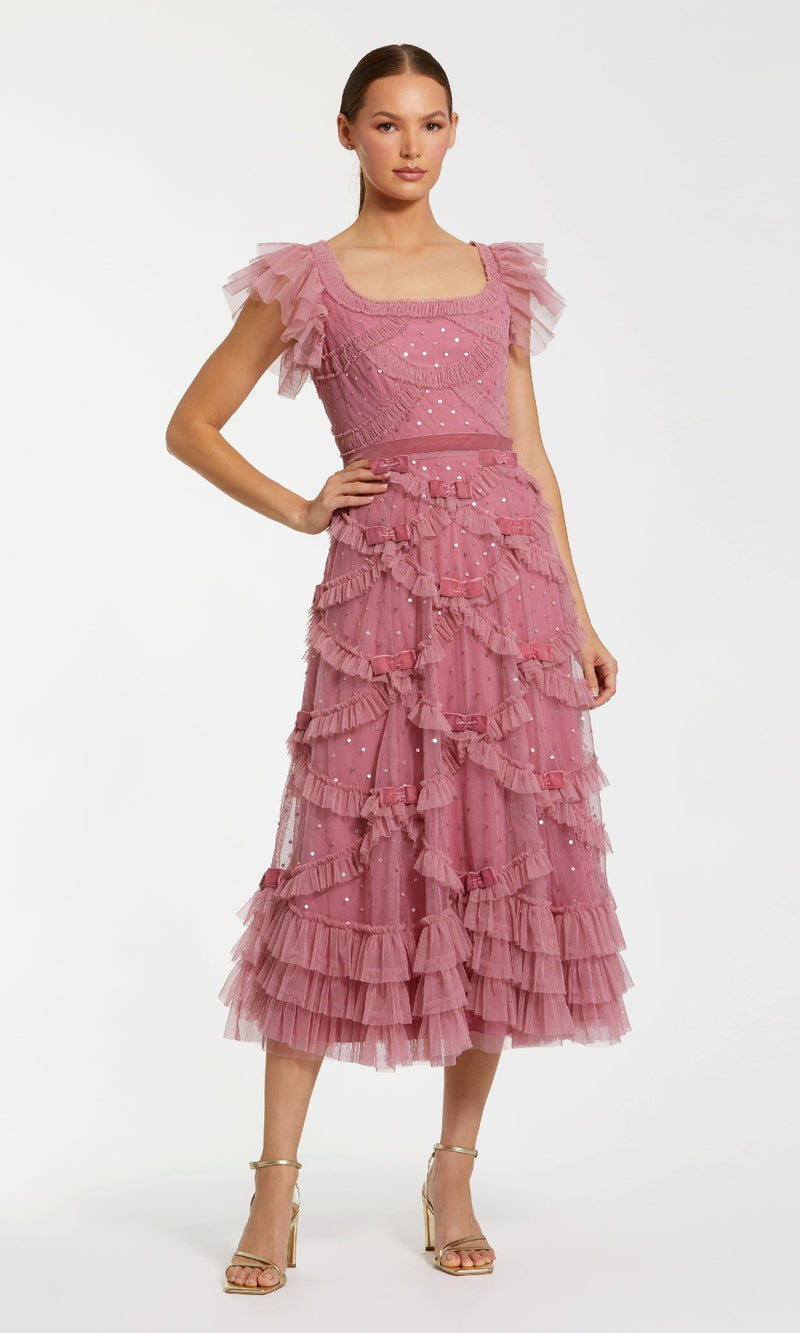 So sweet, this cap-sleeve tea-length antique rose pink wedding guest dress 8272 is simply adorable. From Mac Duggal, this midi pink semi-formal dress has scattered sequins from the square neckline to the hem, while frilly cap sleeves top the bodice. The midi pink party dress has a textured waist that tops the ruffled a-line skirt that flows to a below-the-knee hemline. Scattered bows add to the feminine look of this cap-sleeve tea-length pink wedding guest dress that is sure to leave a lasting impression at weddings, showers, and other semi-formal events.