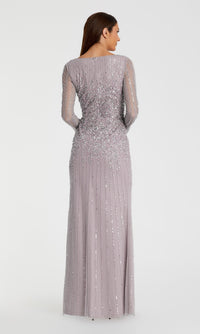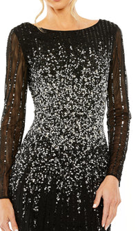 Own the spotlight in this long sleeve long sequin formal dress 9226 by Mac Duggal. With contrasting sequins from the bateau neckline to the hem, this long modest dress shimmers under the lights at weddings, galas, and other formal events. In misses and some plus sizes, this sequin evening gown has sheer long sleeves and a fully-lined long skirt with a sparkly sheer overlay that smooths over the hips before ending at the floor. An impressive choice for your big celebration, this long sleeve formal dress is as dazzling as it is figure flattering.